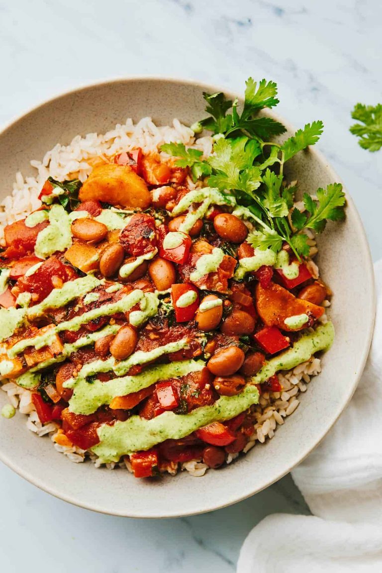 Warm and nutritious stew filled with pinto beans, plantains, tomatoes, kale, and lots of cozy spices. Top it with a swizzle of aji verde and you’re in flavor town!