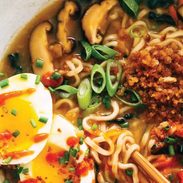 Simmering some garlic, ginger, and dried mushrooms with your chicken broth makes for a great quickie “stock” for your soup base. A good while in the pot will get some nice flavors going that will soon be soaked up by those noodles. And by good while, I mean 19 minutes, because the whole thing takes 20. The soft egg on top will get you all the Instagram likes, and the panko and extra chili oil or Sriracha will light your mouth up with joy.